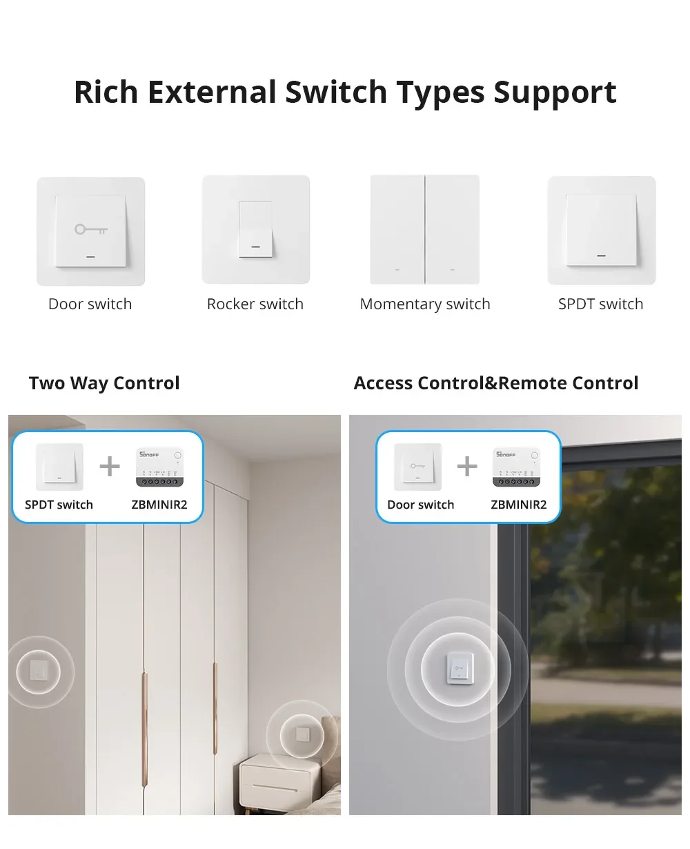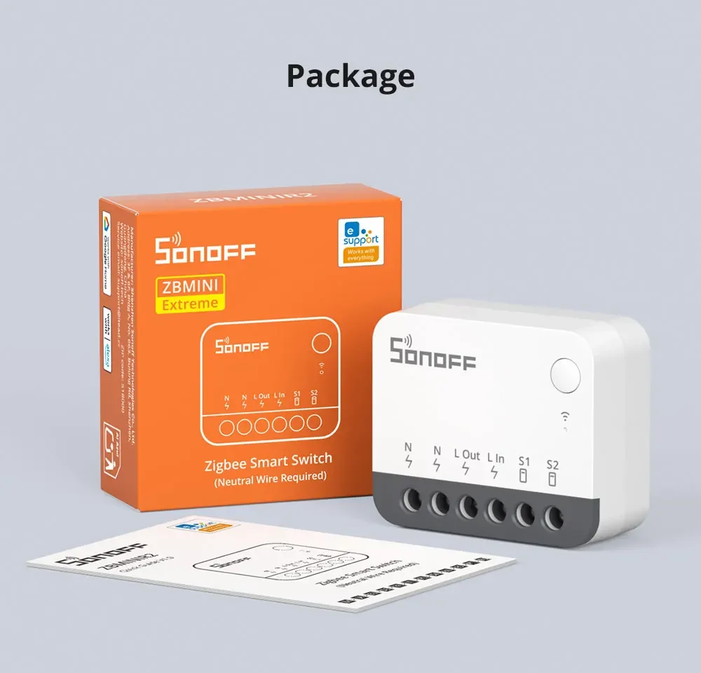 SONOFF ZBMINIR2 is an extremely compact Zigbee 3.0 smart switch, capable of being installed in EU-type/86 type/120 type mounting box and supporting a maximum load of 10A, compatible with various external switch types, upgrading your traditional external switch into a smart one, seamlessly integrating smart technology into your home for enhanced convenience and control.