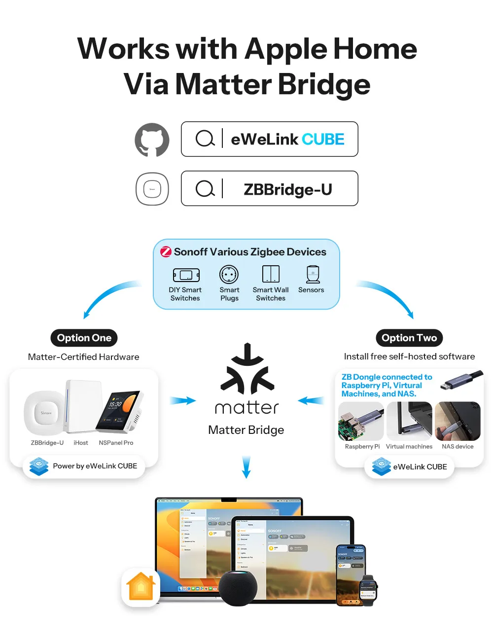 All solutions integrate SONOFF zigbee devices into your Apple ecosystem via Matter Bridge, enabling seamless interconnected device control.